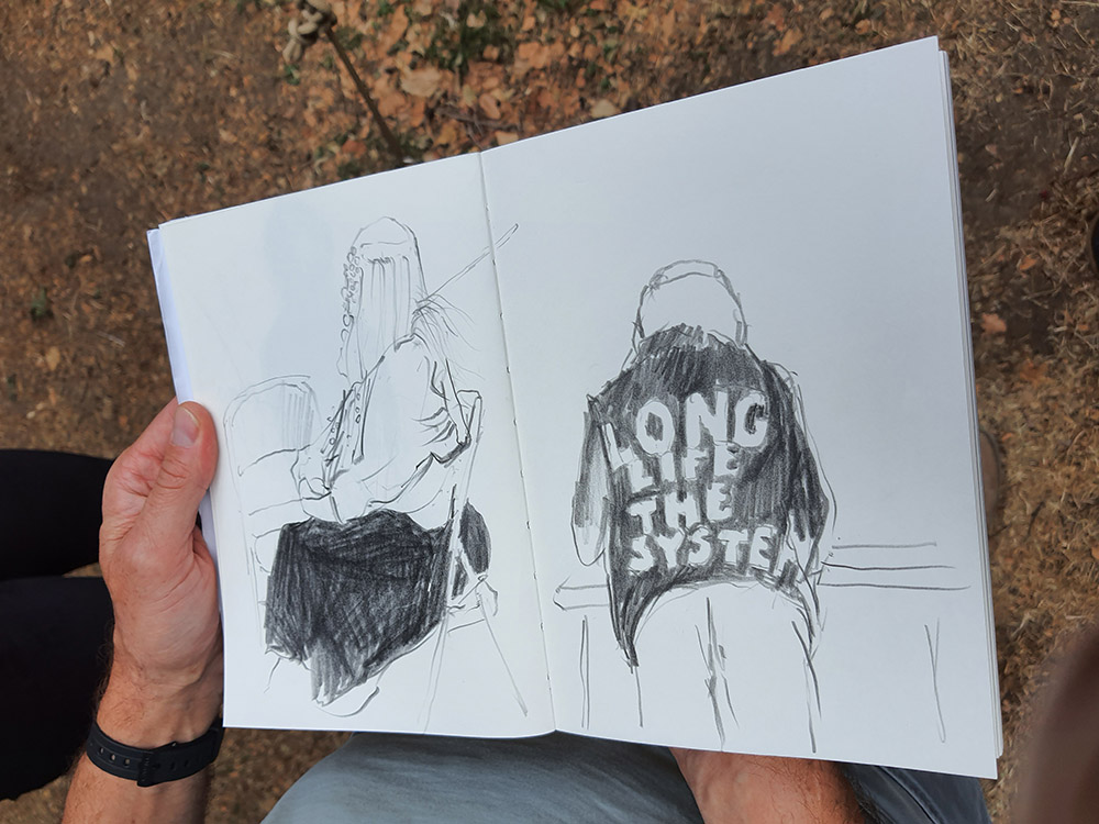 Interessierte Besucher:innen wurden eingeladen, die Performances gemeinsam zu erleben, zu protokollieren und in den unterschiedlichsten Medien zu dokumentieren. Dabei entstanden auch gemeinsame Skizzenbücher, die von Mal zu Mal weitergegeben wurden und als Roherzeugnisse in die Diskussion, in die Fertigung und in die mediale Verbreitung gingen. Diese Produkte und Materialien erlaubten es, die Ereignisse in der Ausstellung zu reflektieren und sind darüberhinaus Zeugnisse, Dokumentation und Werke. Als work in progress wurden sie Teil der bestehenden Ausstellung.