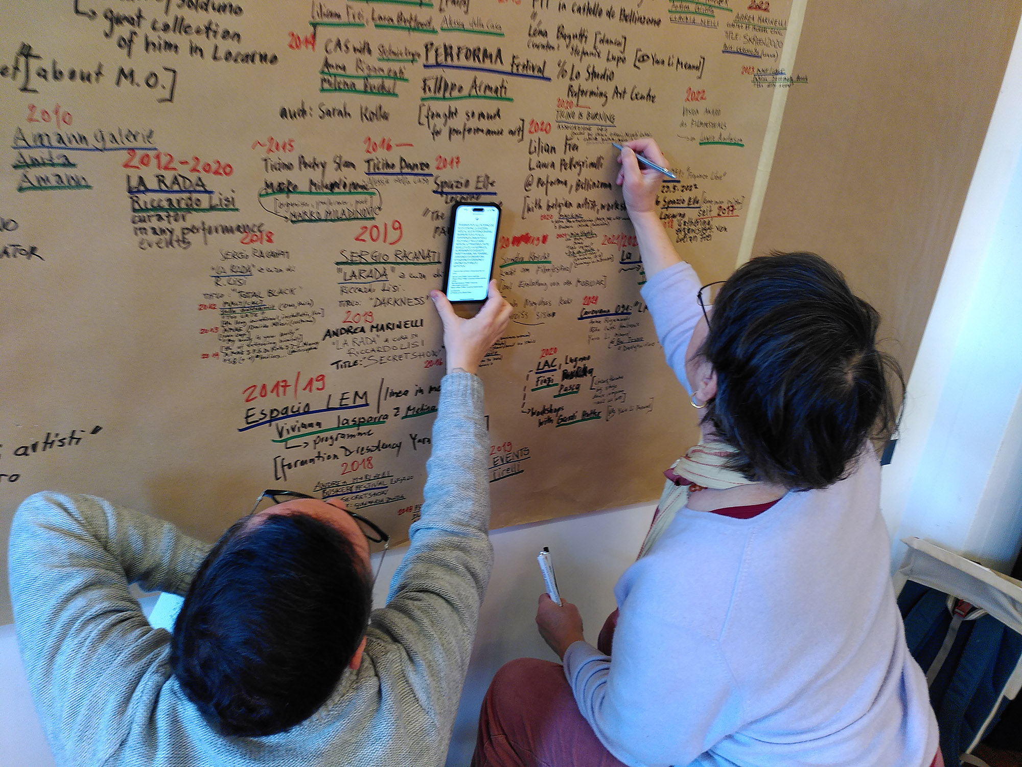 Revolving Histories lud in Bern, St.Gallen, Genf, Lausanne, Luzern und Zürich gemeinsam mit lokalen Gastgeber:innen zu dreistündigen Recherchetreffen ein. Dabei versammelten sich Protagonist:innen der jeweiligen Szenen und aller Generationen, erinnerten sich gemeinsam und erzählten. Dieser Vorgang wurde handschriftlich auf den Maps dokumentiert und floss ein in die Weiterarbeit am Begreifen der Performance Kunst Schweiz als Landschaft. Zugleich wurde bei diesen Treffen das Projekt BANG BANG an eine breite Basis von im Netzwerk Aktiven vermittelt und auf die Online-Plattform der Mediathek FHNW hingewiesen. Hier konnten die Kunstschaffenden und Veranstalter:innen Dokumente zur Performance Kunst hochladen und zum Visionieren und Archivieren freigeben.